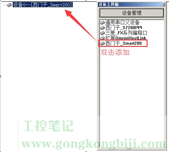 3.点击“设备管理”—PLC—-西门子—-Smart200(双击添加到选定设备),然后点击“确定”保存
