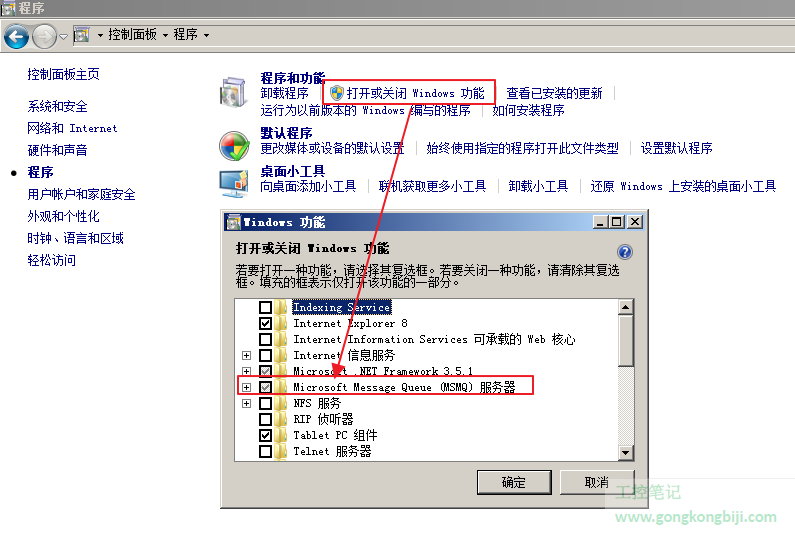 打开或关闭Windows功能—选择MSMQ服务器—确定